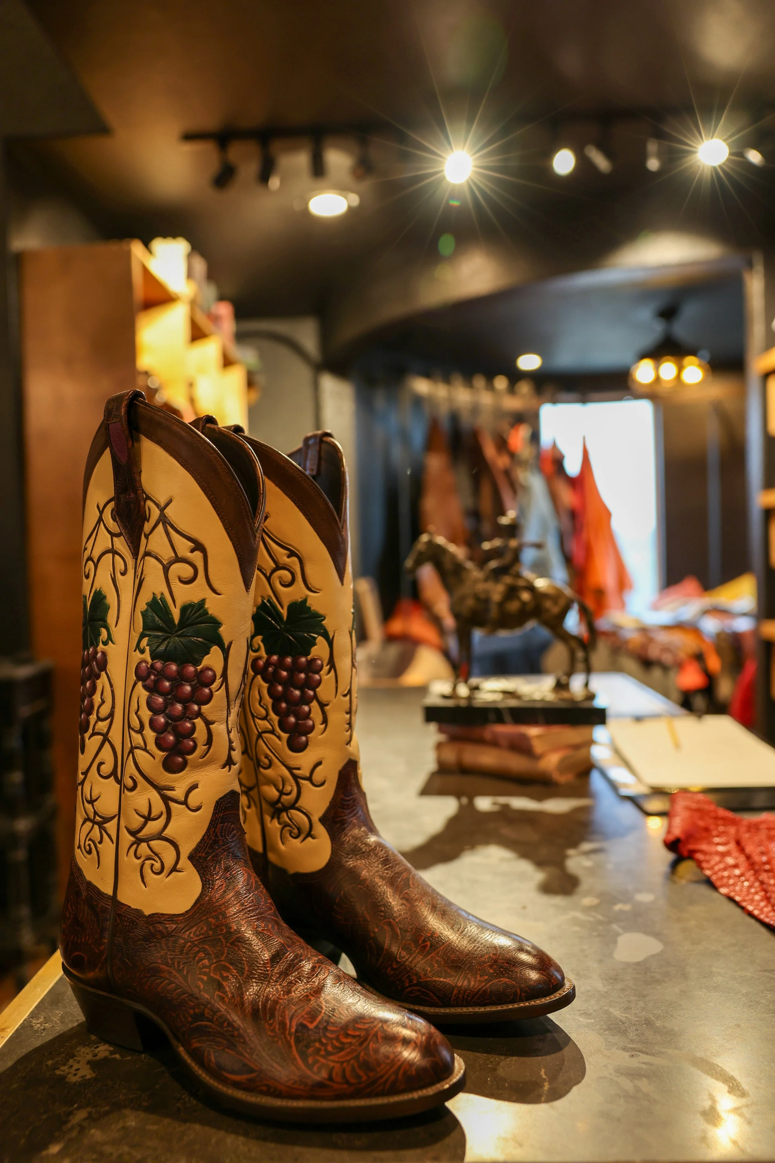 Beautiful handcrafted boots, curated gifts, hats, accessories, drinks flowing, people laughing, music playing, and one of the best porch views in the Hill Country.